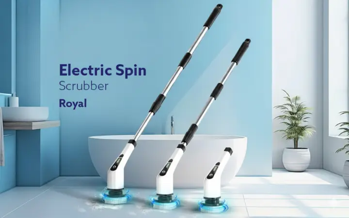The Electric Spin Scrubber is a cordless cleaning brush with a dual-speed motor (250/350 RPM) and a 90-minute battery life. It features an adjustable handle to prevent bending and comes with multiple brush and pad attachments, including a large bristle brush, sponge, and wool cloth. The head is water-resistant for easy cleaning of bathrooms, tiles, and grout.